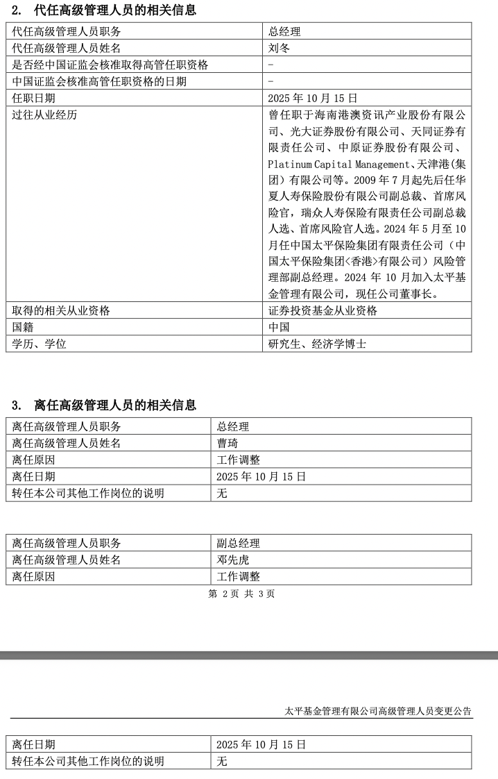 10月16日,太平基金公告称,总经理曹琦、副总经理邓先虎均因工作调整离任,且两人都不转任公司其他工作岗位,离任日期为2025年10月15日;公司董事长刘冬暂代总经理职务。