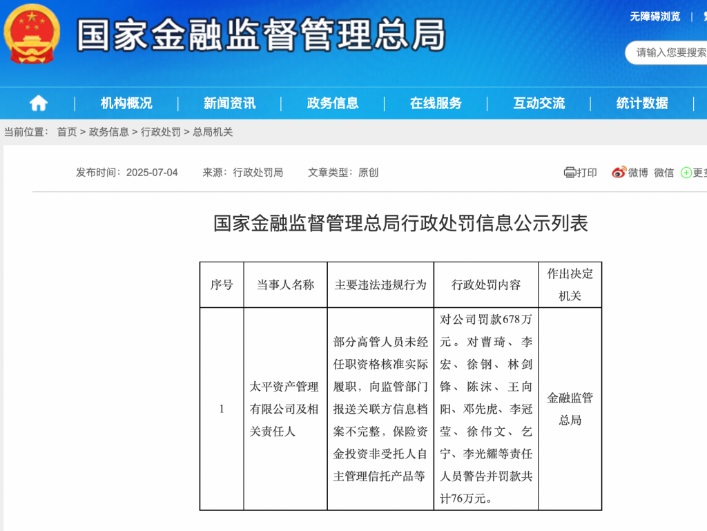 2025年7月4日,国家金融监督管理总局披露的罚单显示,太平资产因多项违规行为被罚款678万元。曹琦、邓先虎等11名责任人员对太平资产的违规行为负有责任,被予以警告并罚款共计76万元。具体违规行为包括:“部分高管人员未经任职资格核准实际履职,向监管部门报送关联方信息档案不完整,保险资金投资非受托人自主管理信托产品等”。
