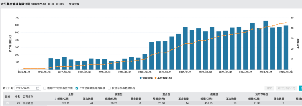 据Wind数据,自2020年三季度开始,太平基金的管理规模明显攀升,并于2024年末触及规模峰值,达657.33亿元,随后规模有所缩水。