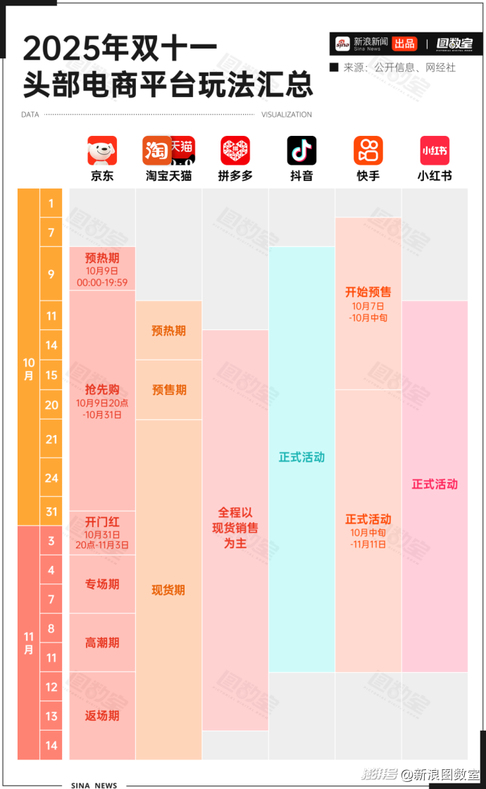 10月7日,快手抢先开启预售;抖音电商紧随其后,9日0点加入战局;京东于9日晚8点正式启动;小红书11日上线,大促持续超一个月;拼多多在14日“开门迎客”;淘天则于15日正式开始活动。
