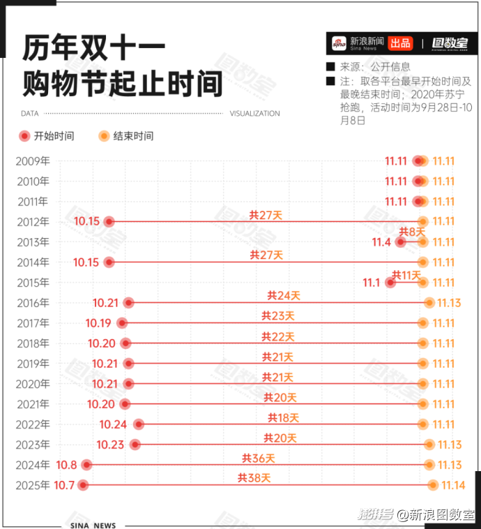 今年双十一,整个促销周期比去年提前一天,结束推迟一天,共计38天,超过去年的36天,被称为新的“史上最长”。