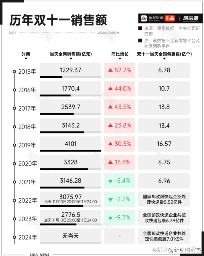 从双十一当天全网销售额来看,近十年时间里,交易额同比增速从52.7%下滑到-9.7%。而包裹数量从2020年开始,出现断崖式下跌,这可能与之一次启用双预售双爆发的活动节奏有关。
