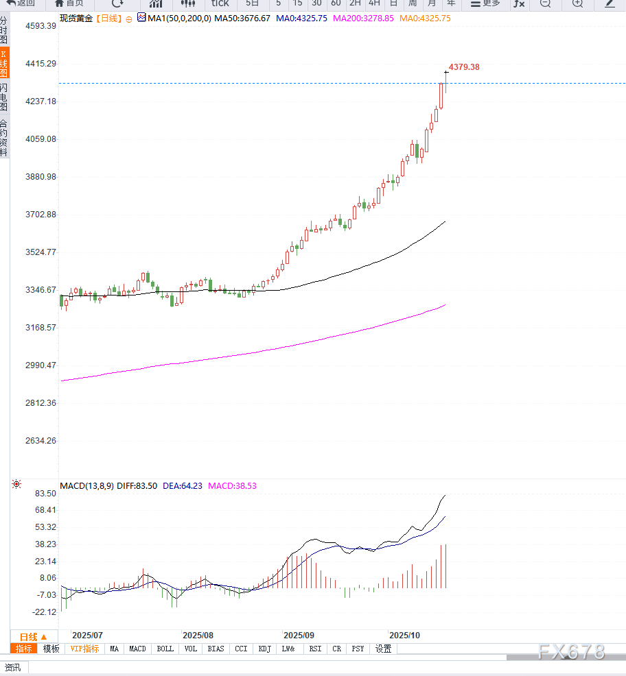汇通财经APP讯——周五亚洲时段,现货黄金(XAU/USD)继续保持上行趋势,盘中一度触及4379美元/盎司,随后再次回落至4300美元附近。