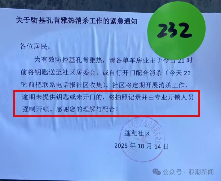 10月15日,浪潮新闻记者以居民身份致电蓬苑社区核实情况,工作人员表示,前述通知属实,但已作废不再强制执行。“开始的时候,因为有些人说没有钥匙,要我们(社区)自己开,我们就开了。现在考虑到大家的意见不一样,我们就不(强制)开门了,不会再撬锁。”工作人员表示,单车房业主目前可以到社区领取灭蚊用品,自行进行消杀。