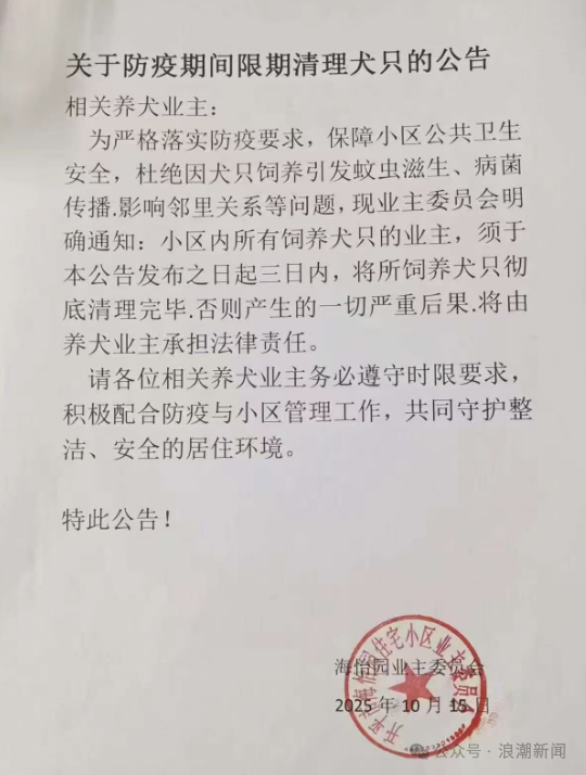 10月15日,江门市海怡园小区业委会发布了《限期清理犬只的公告》,公告明确要求“小区内所有饲养犬只的业主,须于本公告发布之日起三日内,将所饲养犬只彻底清理完毕”。