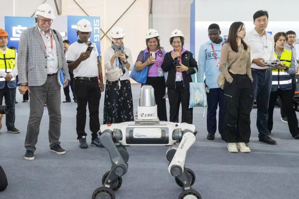 在展厅现场,一款巡检机器狗吸引了多位外国工程师的目光。这款巡检机器狗能够独立完成工地安全、设备状态、物料管理等任务。由于配备了高精度传感器、高清摄像头和激光雷达,它可实现实时数据采集与环境感知,自动识别潜在风险并生成报告。