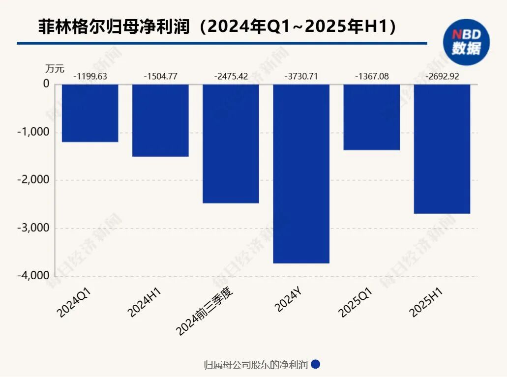需要注意的是,2025年至今,菲林格尔股价累计上涨约10倍,是今年A股市场“大牛股”之一,市场也有人称其为“妖股”。但与此同时,菲林格尔已连续2个年度业绩亏损。今年上半年,公司持续亏损。
