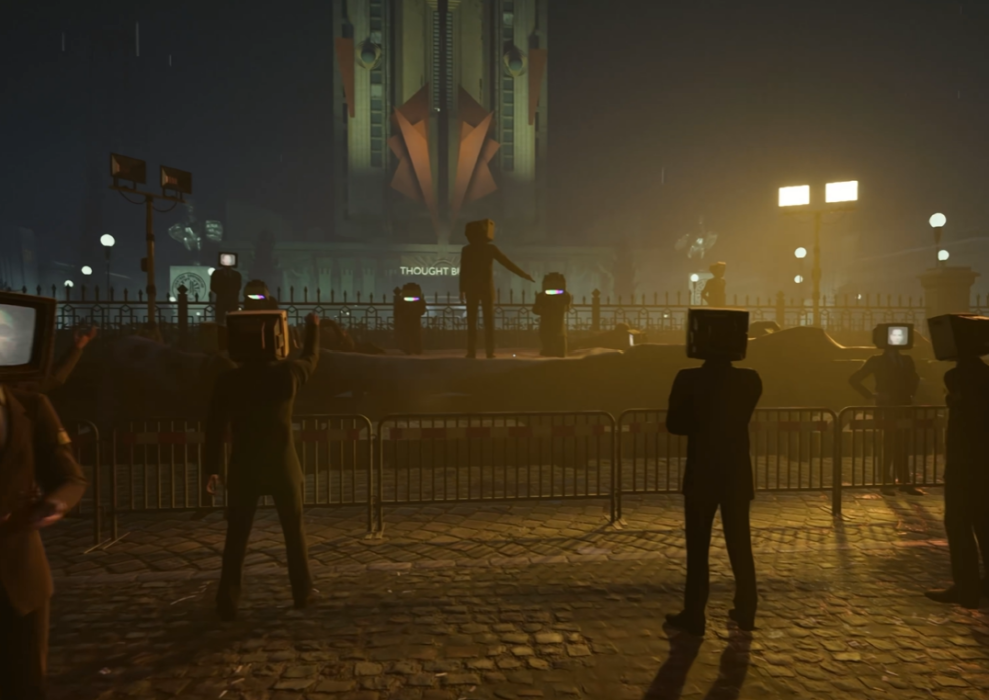 游戏之一关的结尾,玩家走出“温斯顿研究所”来到东德夜晚的街道,走在返回“思想局”的路上。淅淅沥沥的小雨淋湿了这片钢筋混凝土森林,零星的灯光照射着昏暗的街道,路边的广播宣读着国家的敌人被逮捕的消息。街道上路人NPC的造型怪诞又诡异:每个人都有着相同的身高体型,身着千篇一律的深色西装,头部被替换成笨重的老式晶体管电视,说话的声音也完全不是人声,而像是从电视机里发出的、失真的电子音。唯一能够区分这些人的标志,是电视机屏幕上显示出的人脸图像,每个人的年龄、性别和身份就由这一张张抽象又模糊的人脸来代表。广场中央,利维坦公司正在枪决国家公敌,处刑台四周围绕着许多观刑的群众,死刑犯跪地面对着人群,他们的电视机屏幕上没有人脸,取而代之的是电视机信号丢失时产生的彩条画面。彩条画面传递出这样一个象征:“国家公敌”被剥夺了作为社会主体的人的身份、权利和基本保障,他们不再被当作人来对待,而是变成可以被合法施暴的他者。