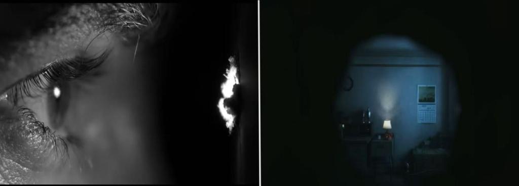 左图:《惊魂记》中凶手窥视女性的小孔;右图:玩家透过父母房间的小孔窥视蕾切尔的房间