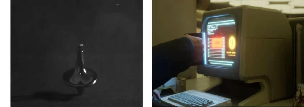左图:游戏结尾处出现的《盗梦空间》陀螺 ;右图:“苏醒”后的员工举杯朝电脑屏幕致意