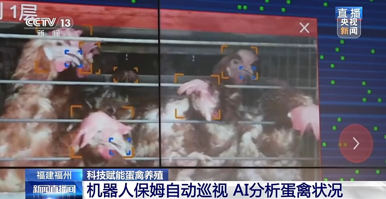 总台记者 黄珊:大家看,这个“木鸡郎”机器人的侧面有八个发光的摄像头,对应的就是一侧四层的鸡架,在行走的过程中,机器人会根据鸡舍的高度,来自动伸缩调整,用摄像头对着每层的鸡笼进行拍照,然后通过AI算法对鸡的外貌和行为特征进行识别比对,来找出问题鸡,整个巡检结果会之一时间上传到了数字平台,也会同步到饲养员的手机里。