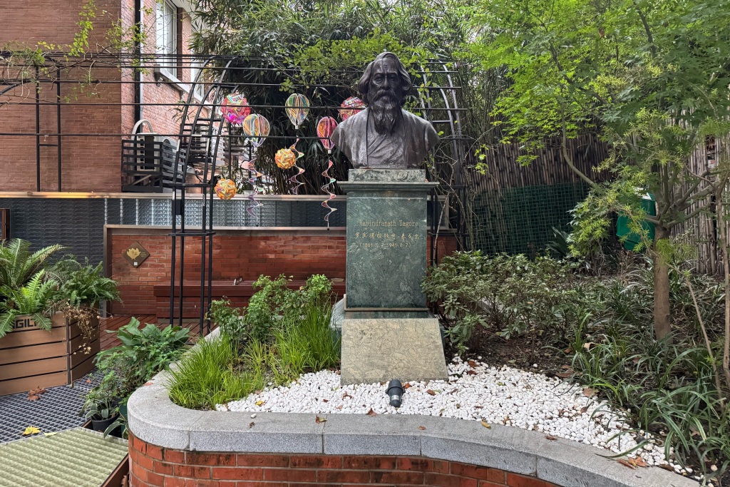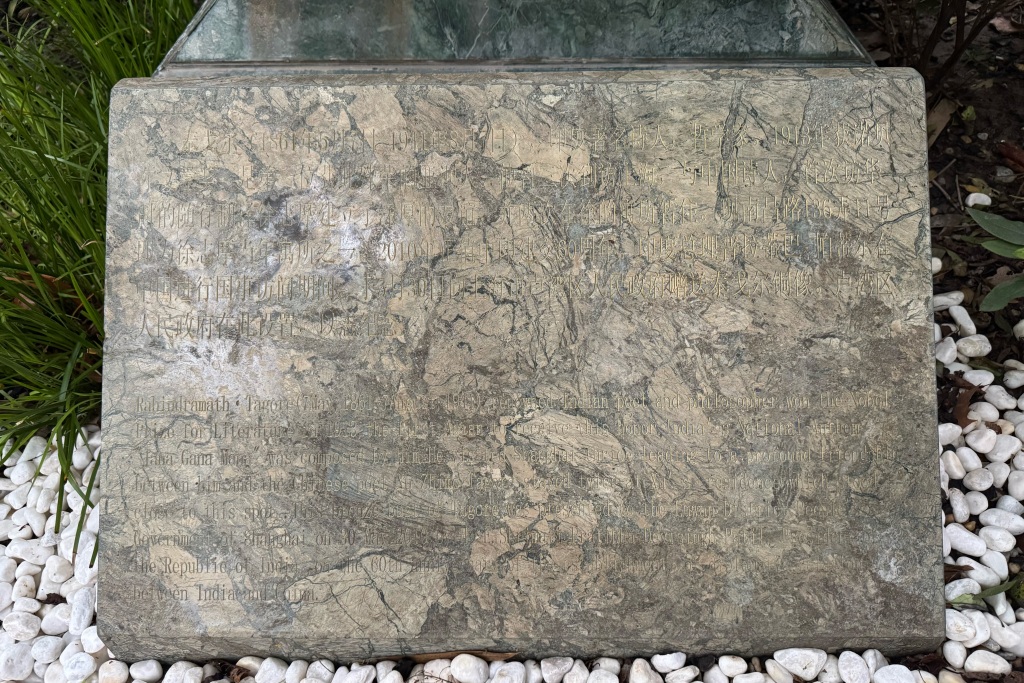 泰戈尔花园塑像下的大理石,刻着其生平及和街区的渊源,但由于反光等原因,肉眼几乎无法识别。鲁怡 摄