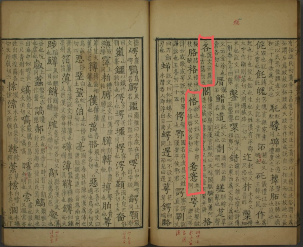 如图,“恪”字注为:“恪,敬也,又姓,晋有中郎令恪啟,苦各切三,㤩、愙並上同”。“苦各切”折合今音约为“ko(入声)”,与今读“kè(去声)”声调有异。其反切下字“各”在《广韵》中注为“古洛切”,拟音约为“go(入声)”,亦与今读“gè”不同。