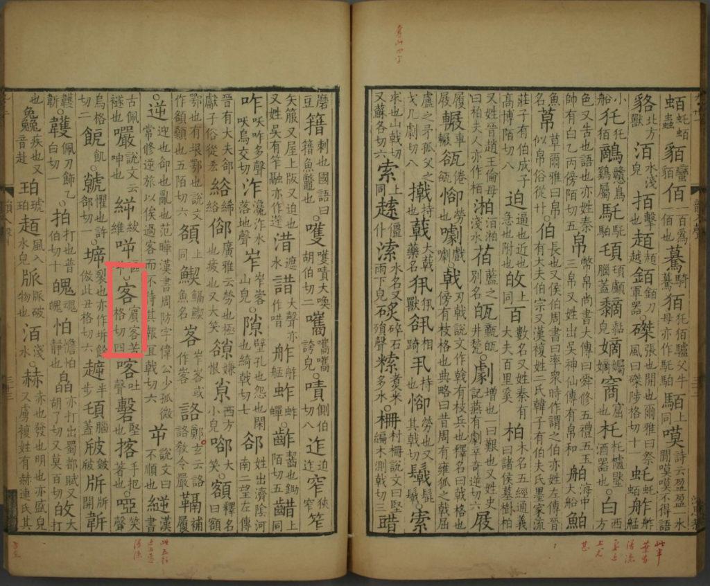 “客”字注为“苦格切”,约为“ke(入声)”。值得注意的是,《广韵》中“恪”“客”分属不同小韵,读音已不相同。今江西修水客家话仍读“恪”为“ko(入声)”,存中古遗韵,与今普通话“kè”明显有别。