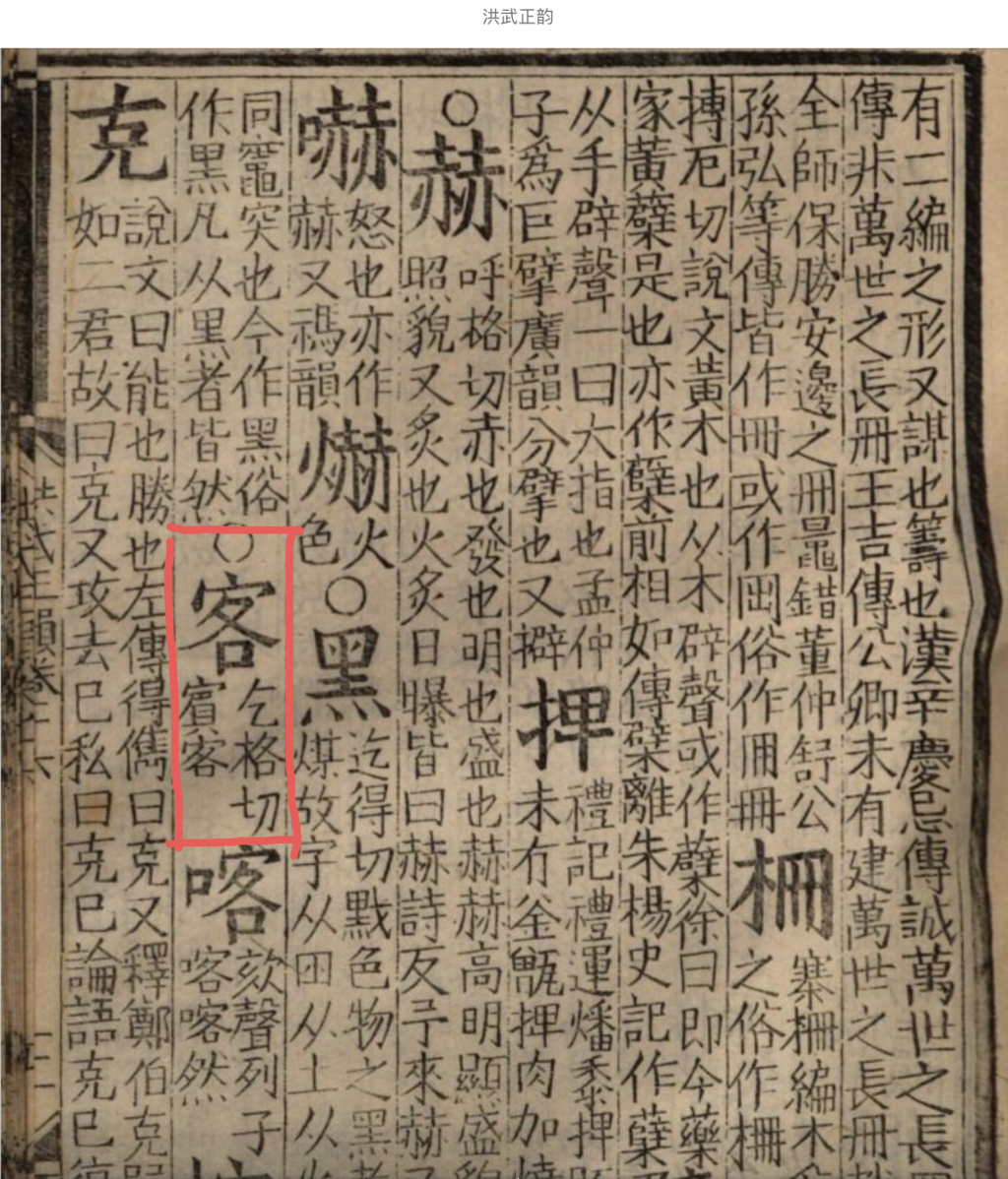 “客”字注为“乞格切”,约为“qe(入声)”。故在《洪武正韵》中,“恪”“客”依然不同音。“恪”音恢复旧读,而“客”音承《中原音韵》之“qe”读法,几无变化。