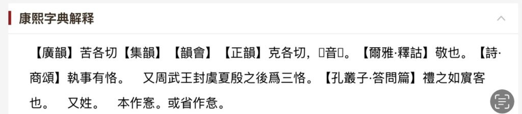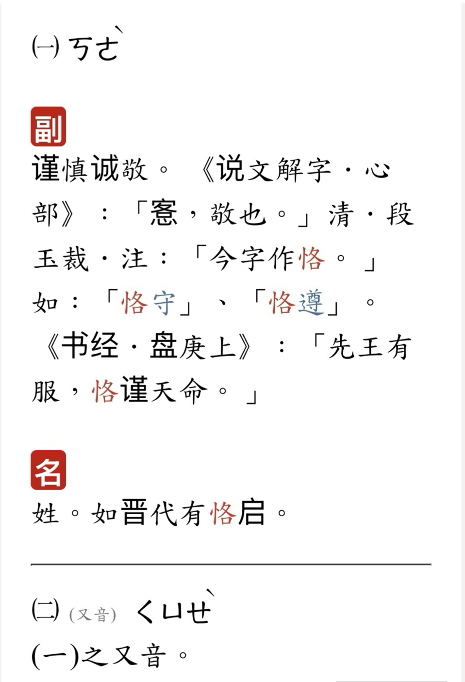 ③《国语辞典》(商务印书馆,1943年版):恪(愙)(㊁ㄑㄩㄝˋ缺。)(又读。)(㊀ㄎㄜˋ)