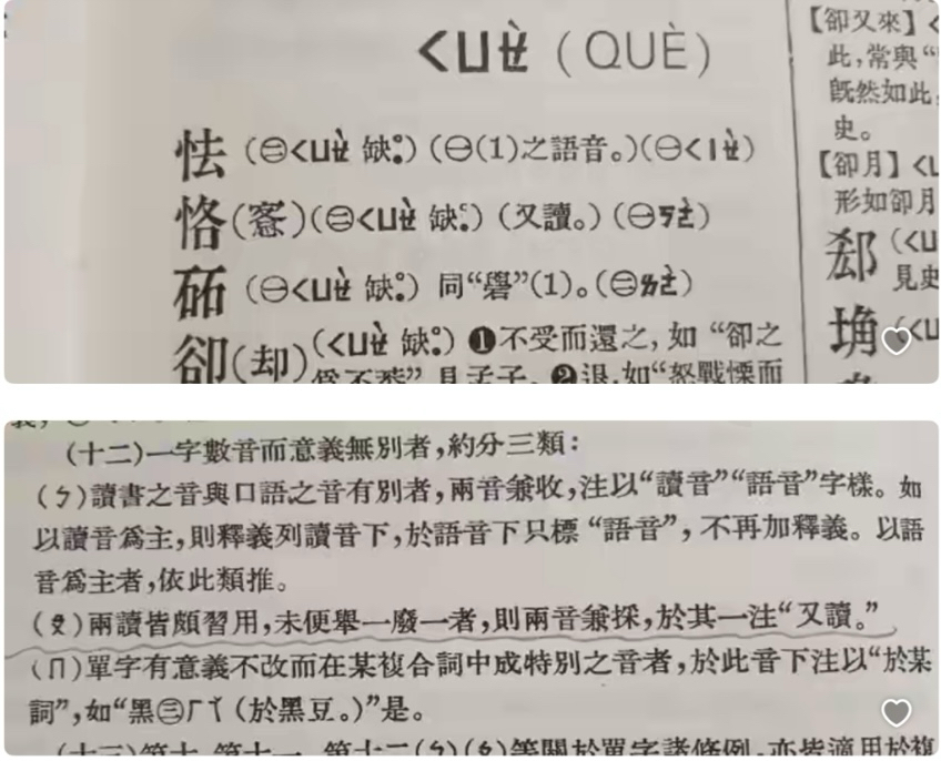 “恪”字注为:“ㄎㄜˋ”(汉语拼音kè,下同),(又读)“ㄑㄩㄝˋ”(汉语拼音què,下同)。自此,各类辞典多将ㄎㄜˋ标为“正读”,ㄑㄩㄝˋ标为“又音”或“旧读”。