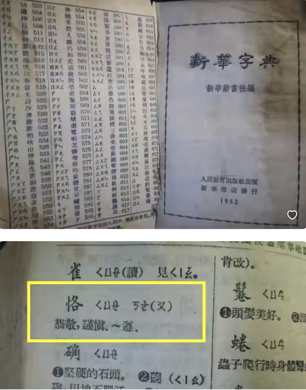 ①1953年人教社初版《新华字典》:恪 くUせ,ㄎㄜ(又)