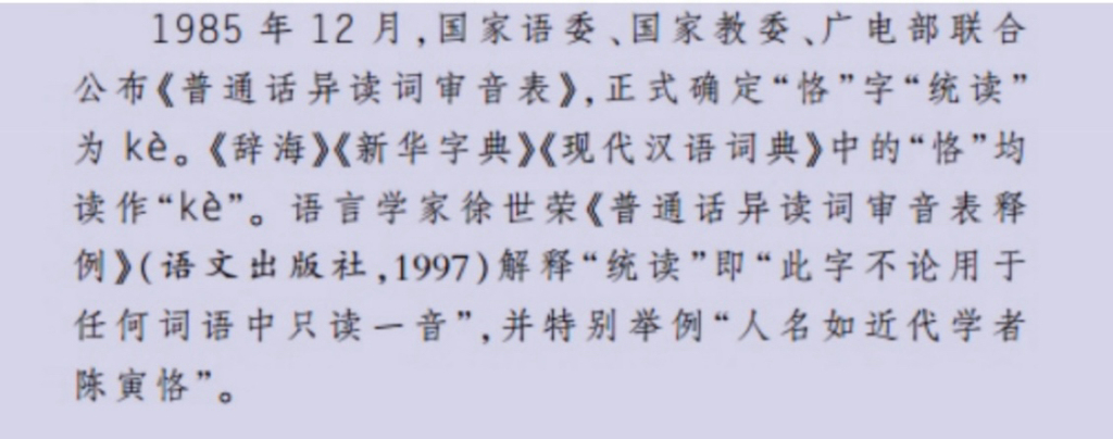 其二,陈寅恪在世时,“恪”读que已获广泛认同,1989年版《辞海》亦注“恪,ke课,旧读que却”。陈寅恪作为历史人物,其姓名从旧读本属自然。即便今人欲统一“恪”字读音,亦不应强行更易早已通行的旧读。
