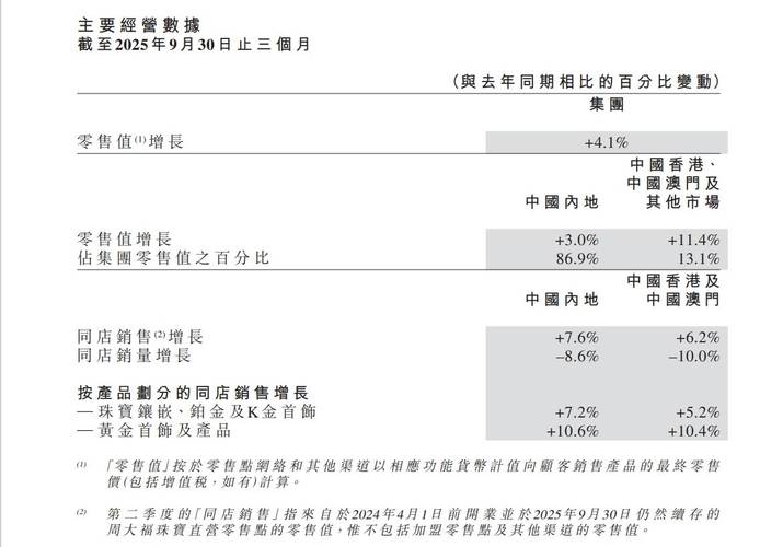 (01929)公布截至2025年9月30日止三个月(第二季度)若干未经审核主要经营数据,零售值同比增长4.1%,其中,中国内地零售值增长3%,中国香港、中国澳门及其他市场零售值增长11.4%。期内,受惠于定价产品的强劲增长势头及计价黄金产品的改善趋势,中国内地以及中国香港及中国澳门的同店销售增长均全面回升。内地方面,直营店于季内的同店销售转为7.6%正增长,而加盟店的同店销售则增长8.6%。若撇除钟表业务,期内直营店的同店销售增长9.9%。中国香港及中国澳门的同店销售同比增长6.2%,其中中国香港上升3.2%,中国澳门则上升17.3%。