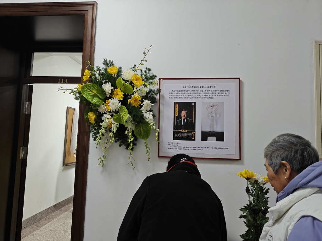 杨振宁先生缅怀室门口墙壁上挂着花束和杨振宁先生相关介绍。