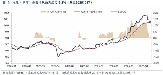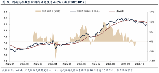 本周中美摩擦冲击后,各主线趋势短期出现一定的分化,电池(-2.2%)、科创芯片(-2.2%)、有色(+3.3%)等依然位于线上/小幅跌破均线,光模块(-7.3%)、PCB(-6.8%)等短期快速跌破均线,创新药则在9.23已经缓慢走平、陷入横盘。(括号中为最新均线偏离度,截至20251017)
