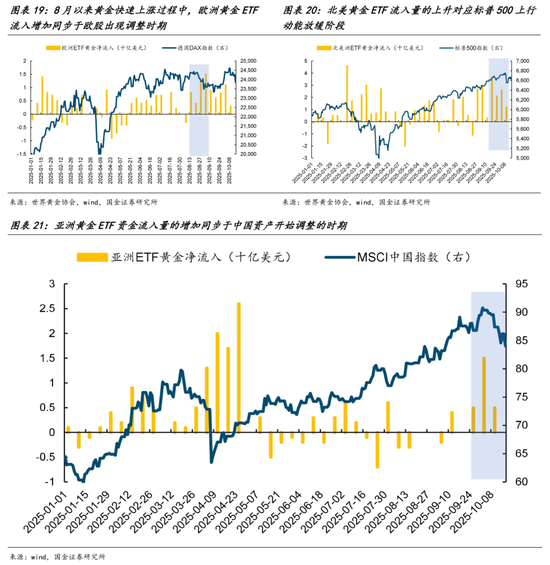 此外,在8月下旬以来黄金快速上涨的过程中存在着一个有趣的现象,黄金ETF资金净流入量的上升似乎对应着权益市场开始出现波动。欧洲市场方面,黄金ETF净流入出现显著提升的时间节点在8月中旬,对应德国DAX指数开始出现回调的时期;美国市场方面,黄金ETF净流入持续放量在9月中旬,对应标普500指数上涨动能有所放缓的时间区间;亚洲市场ETF净流入快速扩张的时期是10月初,对应MSCI中国指数阶段性见顶。这背后的原因可能在于黄金在资产配置中的重要性正在被投资者所认知:在地缘政治风险加剧、海外国家债务压力上升的环境中,黄金的配置需求需要系统性的上升;在权益市场出现调整的时刻,这一切换过程便开始推进。