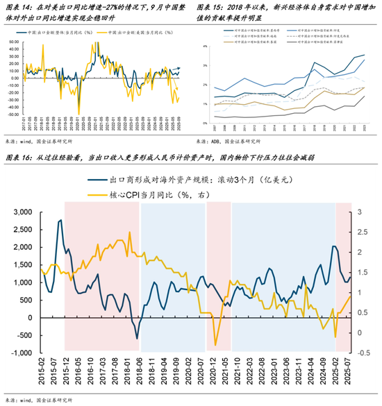 从外贸数据来看,虽然9月中国对美国出口金额同比增速处于-27%的历史低位,但是我国整体对外出口金额反而在9月企稳回升,由4.3%上行至8.3%,表明我国出口对美国的依赖度正在降低,也意味着美国以外的地区制造业活动与实物消费正在增加。同时,趋势上,中国与新兴国家的贸易关系也在变得更为密切,自2018年特朗普之一任期内推动中美贸易战以来,新兴经济体自身需求对中国增加值的贡献率有明显提升。随着美联储开启降息周期,新兴市场制造业活动的修复为我国带来的需求或是未来经济亮点所在。此外,从过往经验来看,当有更多的出口收入通过结汇的方式转化为以人民币计价的资产时,国内物价下行的压力多会出现缓解;因此,如果海外市场确实因为金融系统潜在不稳定性等原因出现大幅调整的话,那么相应也会促进未结汇资金更多回流国内,对国内经济基本面的改善形成一定支撑。