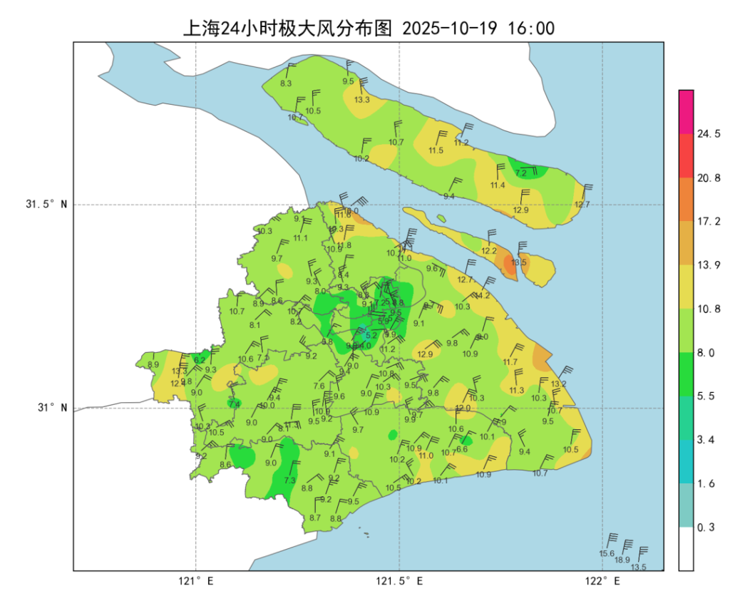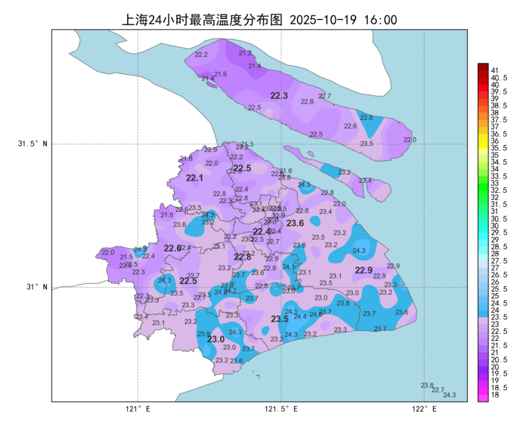 上海今天云系较多,以阴到多云为主,有些地方短时飘了些小雨。早间较凉,大部分地区的更低气温在17~20℃之间,其中徐家汇站19.3℃为更高,这也是6月12日至今129天来,徐家汇站更低气温首次降到“1”字头。白天升温乏力,徐家汇站更高气温22.4℃,风力较大,今天体感还是蛮风凉的。