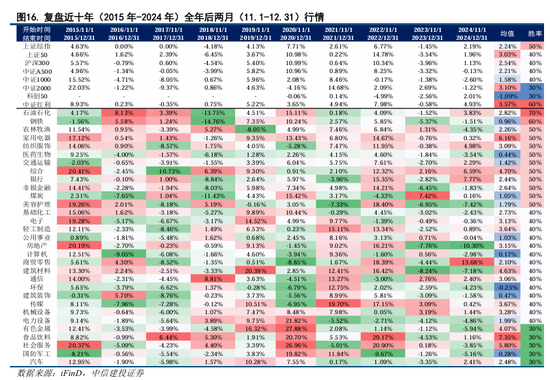 年底盈利多兑现,大盘价值风格往往占优。通过复盘近十年全年后两个月(即2015年至2024年每年11月1日至12月31日)A股行情,我们可知:受“盈利兑现、落袋为安”的需求影响,及上证综指表现较优;行业结构上,红利及大盘价值风格往往占优,石油石化/钢铁/煤炭等红利板块,以及银行/非银金融等金融板块胜率较高。