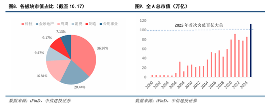 资本市场“量质齐升”态势显著。1)截至10月17日,A股总市值达113.02万亿元,较“十三五”末增长35.51%;目前,我国债券市场规模居全球第二位,期货成交量稳居全球之一位,资本市场的广度和深度得到显著提升;2)市场结构优化在市值分布上体现得尤为明显:目前A股科技板块市值占比超四分之一,已明显高于银行、非银金融、房地产行业市值合计占比。市值前50名公司中,科技型企业从“十三五”时期末的18家提升至当前的24家。