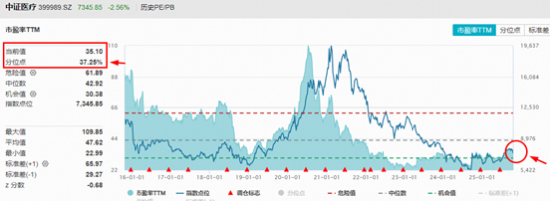 A股医疗板块此前连年走低,尽管今年显著修复,但价格及估值仍处于历史低位,安全边际较高。例如,医疗ETF(512170)标的指数最新PE估值35.1倍,低于近10年60%以上时间区间,具备较高配置性价比。
