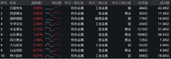 成份股方面,铜业龙头逆市涨停,锂业龙头涨超2%,锂业龙头亦涨逾2%。值得关注的是,涨幅前十大成份股中,黄金龙头占据5席,其中,涨超3%,涨逾2%,、、等个股跟涨。另一方面,跌超7%,、跌逾6%,跌幅居前,拖累指数表现。