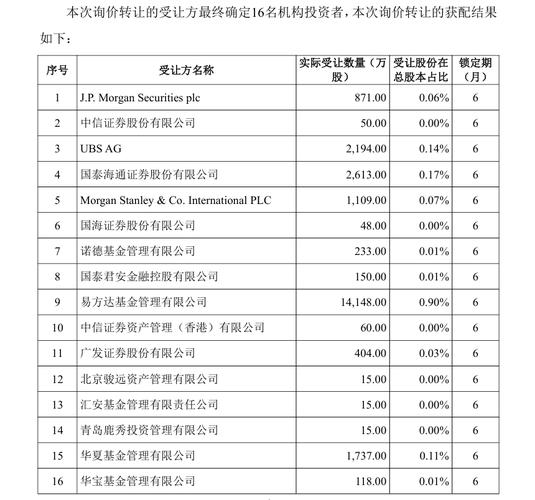 值得一提的是,沈友根已于今年7月份进行过一次询价 *** ,当时15880万股股份以总价约34.4亿元完成 *** ,吸引了包括阿布达比投资局、摩根士丹利、摩根大通、瑞银、易方达基金、中信证券、国泰海通等多个知名中外资机构投资者参与。
