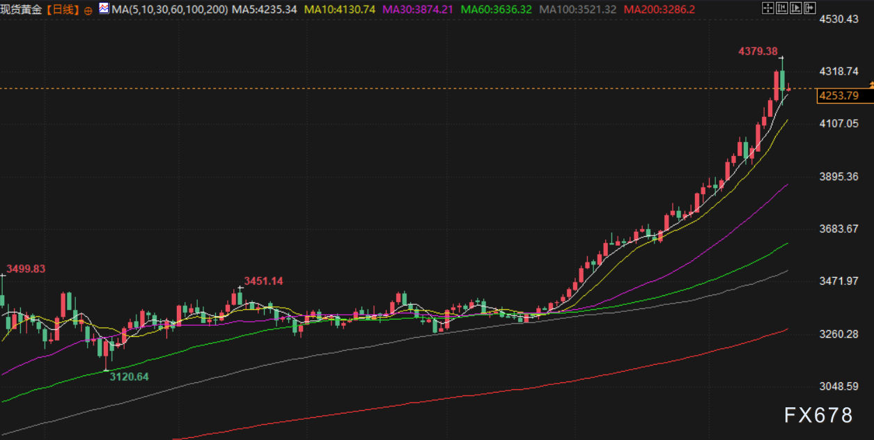 现货金上周五盘初一度触及历史高点4378.69美元。周涨幅达到4.8%左右。12月交割的美国期金收低2.1%,报4213.30美元。