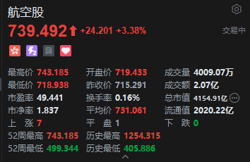 10月20日消息,港股航空股走强,其中,中国东方航空续涨近7%4日连涨超20%,中国南方航空涨超4%,涨超3%。