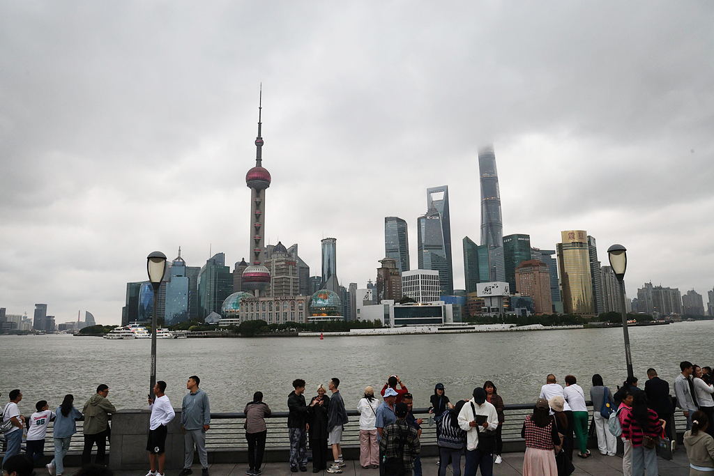 10月18日,上海,游客冒着大风在外滩观光观景台游览。
