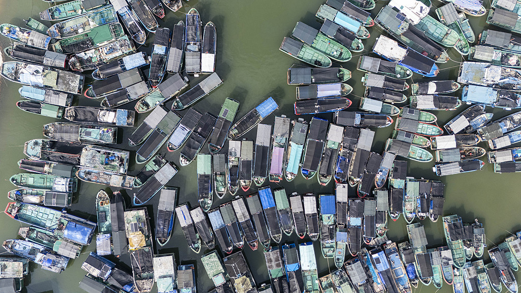 10月19日,海南省万宁市的渔船在渔港避风。海南省气象局当日10时30分发布台风四级预警,海南各地的渔船陆续返港避风。