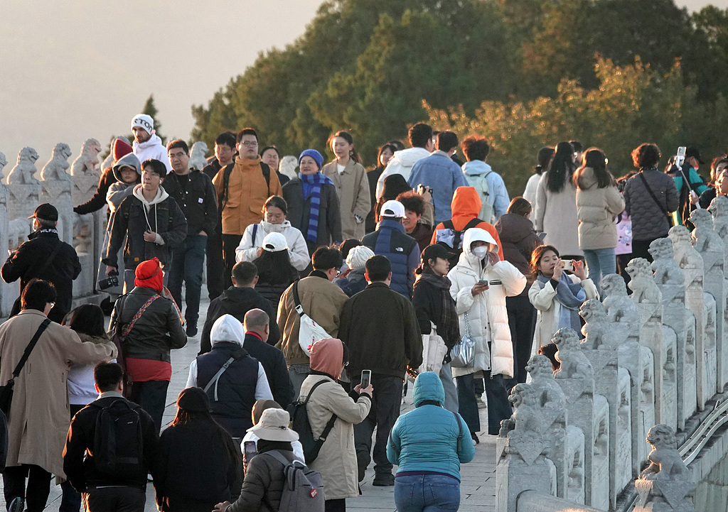 10月19日,北京迎大风寒潮天气,游客穿厚实冬装在寒风中游览颐和园。