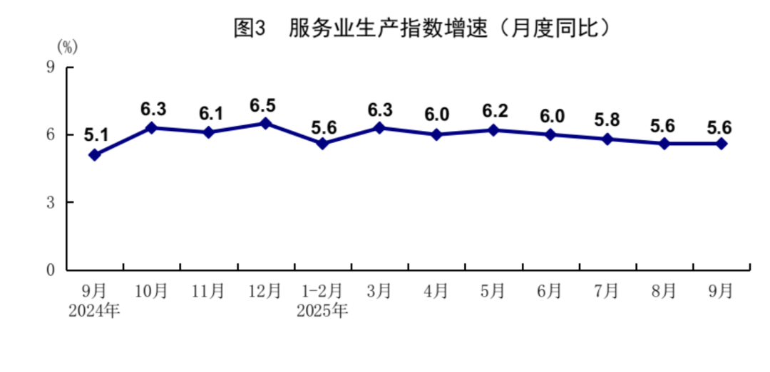 前三季度,服务业增加值同比增长5.4%。其中,信息传输、软件和信息技术服务业,租赁和商务服务业,交通运输、仓储和邮政业,批发和零售业增加值分别增长11.2%、9.2%、5.8%、5.6%。9月份,全国服务业生产指数同比增长5.6%。其中,信息传输、软件和信息技术服务业,金融业,租赁和商务服务业,交通运输、仓储和邮政业生产指数分别增长12.8%、8.7%、7.8%、5.7%。1-8月份,规模以上服务业企业营业收入同比增长7.7%。9月份,服务业商务活动指数为50.1%,服务业业务活动预期指数为56.3%。其中,邮政、电信广播电视及卫星传输服务、货币金融服务等行业商务活动指数位于60.0%以上高位景气区间。