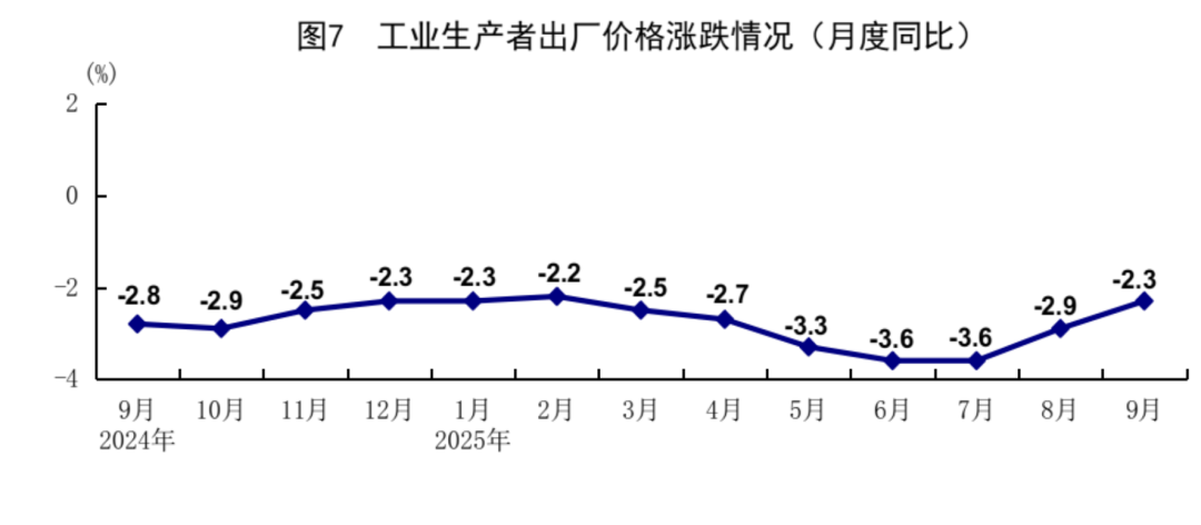 前三季度,全国工业生产者出厂价格同比下降2.8%。其中,9月份同比下降2.3%,降幅比上月收窄0.6个百分点,环比持平。前三季度,工业生产者购进价格同比下降3.2%。其中,9月份同比下降3.1%,降幅比上月收窄0.9个百分点,环比上涨0.1%。