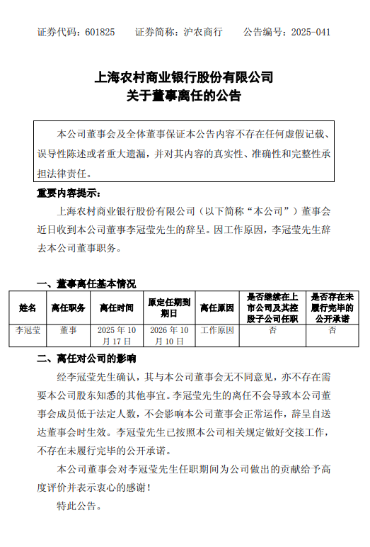 10月20日金融一线消息,公告,公司董事会近日收到董事李冠莹的辞呈。李冠莹因工作原因,辞去公司董事职务。李冠莹的离任不会导致公司董事会成员低于法定人数,不会影响公司董事会正常运作。公司将对李冠莹任职期间的贡献表示感谢。
