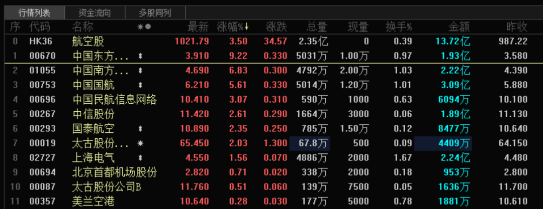 今日午后,港股航空股持续走高,中国东方航空股份一度涨超10%,中国股份一度涨超7%,涨超5%,国泰航空跟涨。东方航空、南方航空、等A股也是集体拉升。