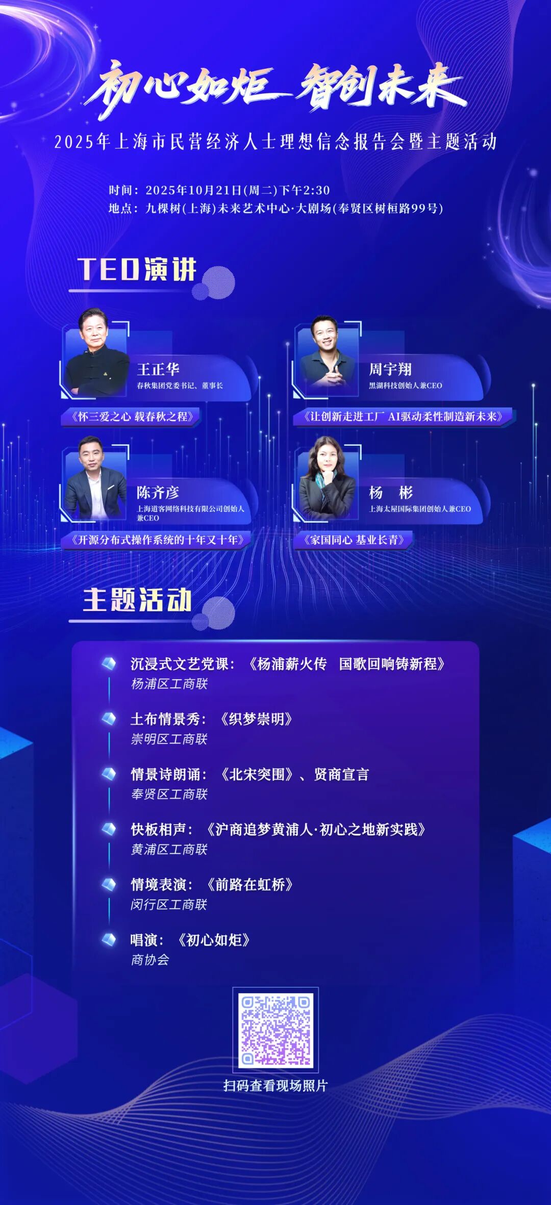 10月21日,2025年上海市民营经济人士理想信念报告会暨主题活动将在九棵树(上海)未来艺术中心举行。