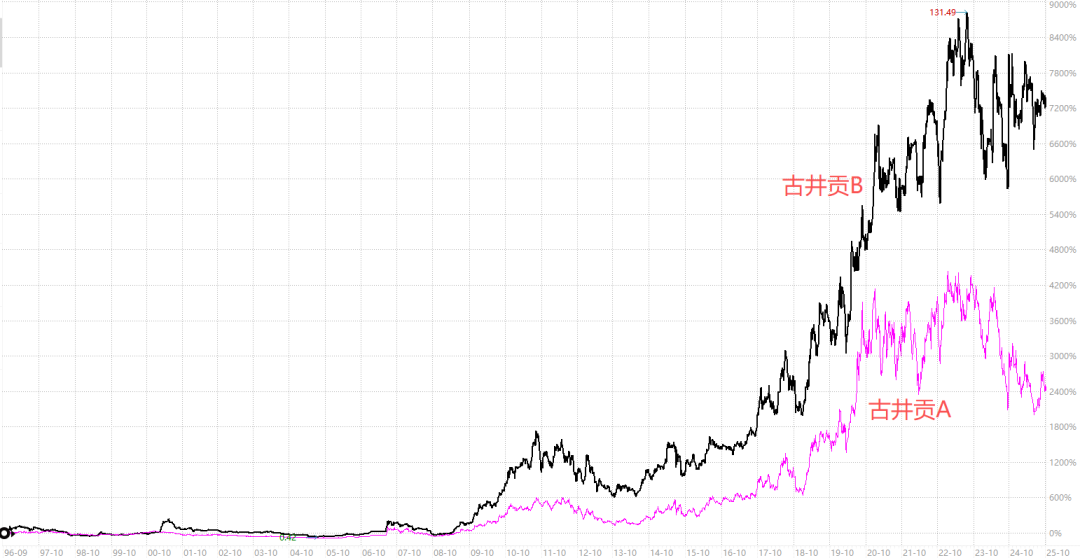 事实上,从1996年上市开始,古井贡B和古井贡A的走势如下图。