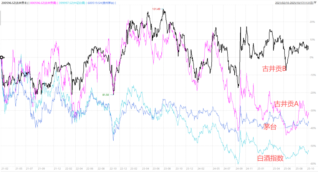 从2021年2月白酒的更高点算起,古井贡B和其他白酒的走势如下图。