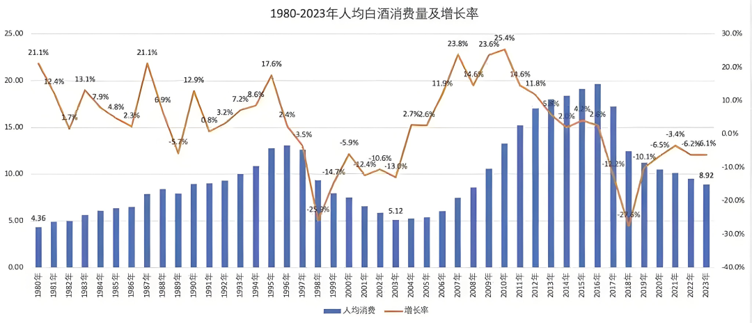 但其实吧,不少年轻人早就不喝白酒了。中国的人均白酒消费量从2016年起就开始下行了,但这并不妨碍白酒2016年后的大牛市。
