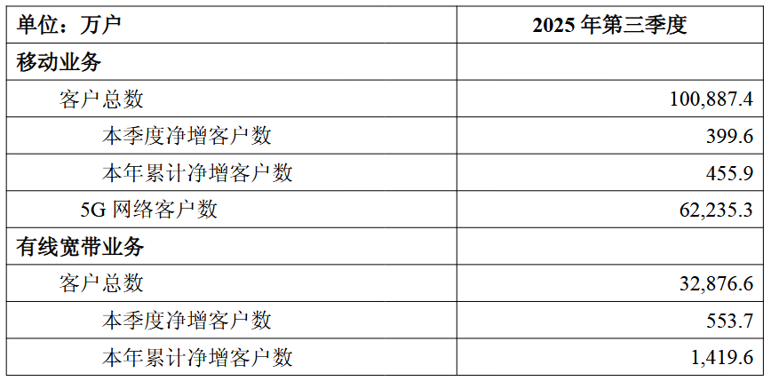 10月20日,(600941/00941/80941)发布公告,2025年第三季度,公司移动业务客户总数达10亿户,本季度净增客户400万户;有线宽带业务客户总数达3.29亿户,本季度净增客户数554万户,具体如下: