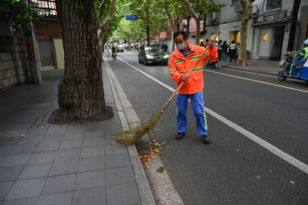 2025年10月20日,武康路,环卫工人刘师傅正在清扫法梧叶。