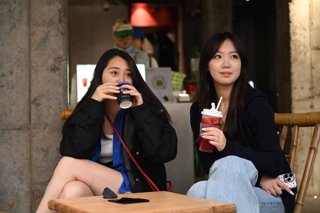 2025年10月20日,安福路,点了一杯冰饮一杯热饮的两名女子。